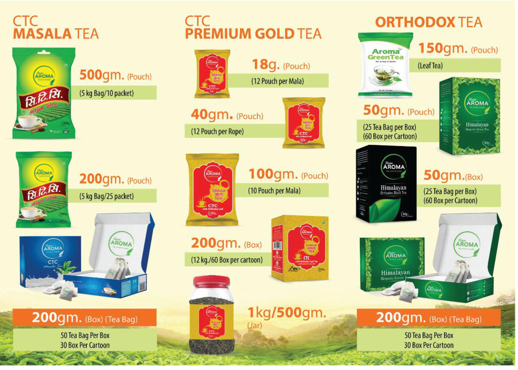 ASTI’s B2C tea brands bring Himalayan flavor to everyday cups through robust CTC teas and smooth Orthodox blends. The CTC range, including Masala Tea and Premium Gold Tea, delivers bold, full-bodied brews ideal for a strong, energizing drink, available in convenient pouches, boxes, and jars from 18g to 1kg. The Orthodox selection, featuring Himalayan Black Tea and Himalayan Organic Green Tea, offers a refined, aromatic experience in both loose-leaf and tea bag formats, making premium quality accessible for daily enjoyment.